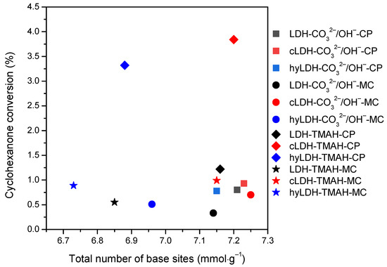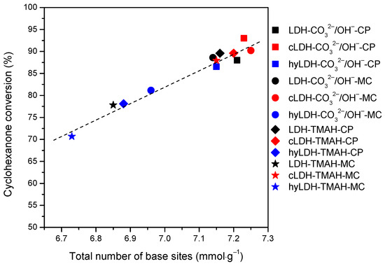 The cyclohexanone conversion vs. total number of base sites for investigated catalysts (2 h, 120 °C, 20 mg of catalyst, solvent-free).