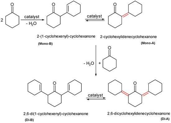 The conversion of cyclohexanone in the blank test after 2 h at room temperature did not exceed 1%, while at 120 °C the conversion increased up to 6% with a selectivity of 91.5% to 2-(1-cyclohexenyl)-cyclohexanone (mono-condensed product/Mono-A). This reaction commonly proceeds via an enolate ion intermediate where the double bonds are able to cyclically migrate between the two cycles generating (Di-A) and (Di-B) products (Scheme 3) [47].