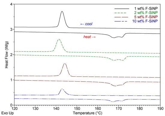 Overlay of DSC heating and cooling after third cycle at various wt % F-SiNP loadings in PVDF.