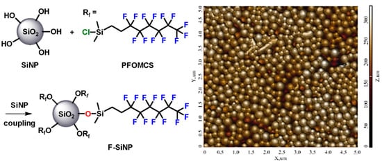 Synthesis of fluorinated silica nanoparticles (F-SiNPs) (left) and accompanying AFM X–Y phase with Z height diagram of the F-SiNPs with average 200 nm diameter, as determined from graphical software (right).