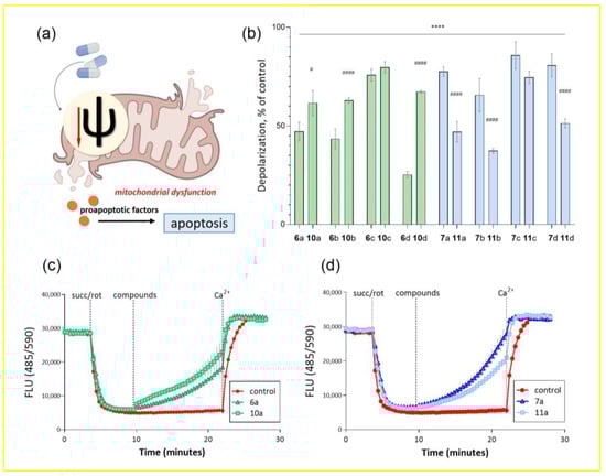 As an example, for compounds 6a, 10a and 7a, 11a, Figure 2c,d show the kinetic curves of changes in the fluorescence of a mitochondrial suspension over time after the addition of modulators for a more visual presentation of the results. Thus, when succinate and rotenone were added, mitochondrial membrane energization and a decrease in the fluorescent response of the voltage-dependent label of safranin A were observed. Against this background, the test compounds were added, and a reaction was observed over a certain period of time accompanied by an increase in fluorescence in the samples and no changes in the control. The 100% depolarization of the mitochondrial membrane was observed upon the addition of calcium ions, which induce the opening of mitochondrial pores and lead to energetic collapse of organelles.