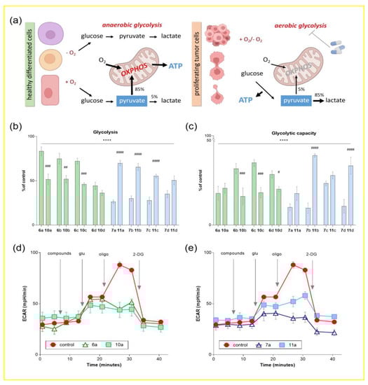 As an example, for compounds 6a, 10a and 7a, 11a and better visualizing of the results obtained, Figure 3d,e shows the kinetic curves of ECAR changes in cells over time, as modulators are added. Thus, glucose injection led to a sharp increase in this indicator, while the cells pretreated with the studied compounds showed ECAR suppression. A similar situation was also observed in the case when the addition of oligomycin in the control samples showed the maximum glycolytic activity. In turn, under the action of 6a, 10a and 7a, 11a, a decrease in ECAR by more than 50% was noted.