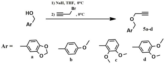Benzylpropargyl ethers 5a–d were used as the second, acetylene block, to implement the “click” reaction, the synthesis of which was performed by alkylation of the corresponding benzyl alcohols with propargyl bromide (Scheme 2).