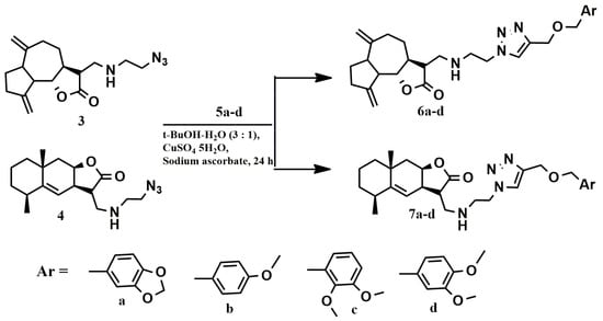 The [2 + 3]-cycloaddition of azides 3 and 4 to acetylenes 5a–d was carried out in accordance with the previously chosen conditions for the “click” reaction (Scheme 3) [33]. The course of the reaction was monitored using thin layer chromatography. Target conjugates 6a–d and 7a–d, which are viscous oils, were isolated by column chromatography. The composition of compounds 6a–d and 7a–d was established by elemental analysis and mass spectrometry, and the structure was proved by IR, 1H, 13C NMR spectroscopy (Supplementary materials). The main criteria indicating the formation of trizole ring were observed in all spectra. In the 1H NMR spectra of the reaction mass there are signals in the region of 7.64–7.70 ppm, characteristic of the =C-H proton of the triazole heterocycle. The 13C NMR spectra contained signals at 123.06–123.19 and 144.59–144.97 ppm which could be assigned to the carbon atoms of the 1,2,3-triazole ring.