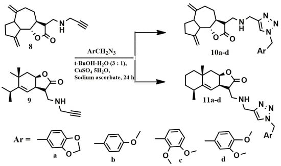 The next stage of our work consisted of studying the biological properties of the target conjugates of dehydrocostuslactone and allantolactone 6a–d, 7a–d, 10a–d and 11a.