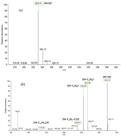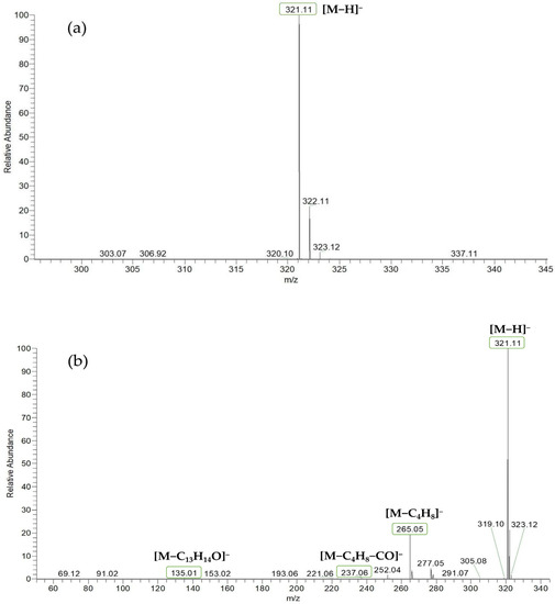 Based on the mass spectral fragmentation pathways reported in the literature and the fragment information of neobavaisoflavone, the result showed that neobavaisoflavone generated the [M−H]− ion at m/z 321.11 (C20H17O4, tR 11.47 min, 0.316 ppm) and the [M+H]+ ion at m/z 323.13 (C20H19O4, tR 11.47 min, 3.700 ppm). In negative ion mode, characteristic fragment ions were detected: m/z 265.05 [M−H−C4H8]−, m/z 253.05 [M−H−C5H8]−, m/z 237.06 [M−H−C4H8−CO]−, and m/z 209.05 [M−H−C4H8−CO−CO]−. The fragment ion at m/z 135.01 was formed by retro-Diels-Alder (RDA) fission. In positive ion mode, characteristic fragment ions were detected: m/z 267.06 [M+H−C4H8]+, m/z 255.06 [M+H−C5H8]+, m/z 239.07 [M+H−C4H8−CO]+, m/z 211.07 [M+H−C4H8−CO−CO]+, and m/z 183.08 [M+H−C4H8−CO−CO−CO2]+. The fragment ion at m/z 137.02 was formed by RDA fission. The DPIs and NLFs of neobavaisoflavone provided guidance for the subsequent identification of metabolites. The MS (a), and MS2 (b) spectra and proposed fragmentation pathways of neobavaisoflavone were summarized, as shown in Table 1 and Figure 1, Figure 2, Figure 3 and Figure 4.