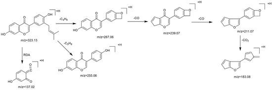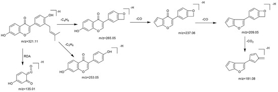 M29 was eluted at 7.21 min and had [M−H]− ion at m/z 335.13 (C21H19O4, error with −4.314 ppm). The fragment ion at m/z 265.05 was formed due to the losses of CH3 and C4H7. The ion at m/z 321.11 was another characteristic fragment ion. These results indicated that M29 was the product of methylated neobavaisoflavone.