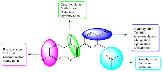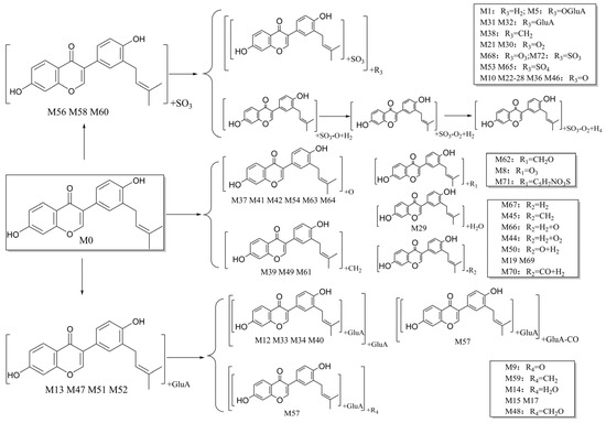 After the neobavaisoflavone was absorbed, 28 metabolites were detected in plasma samples, 43 in urine samples, 18 in feces samples, and six in the liver samples. In addition, four metabolites were detected in liver microsome samples. Neobavaisoflavone was detected in all samples except for liver samples. These data showed that it would be metabolized and excreted in urine and feces partially after neobavaisoflavone was absorbed into the blood through the gastrointestinal tract. The products of glucuronidation, sulfation, oxidation and cyclization were identified in plasma samples. In the urine samples, metabolites were formed by phase I metabolism, such as hydration, dehydration, oxidation, and reduction reactions. Hydroxylated products were found primarily in feces samples. There were few metabolites in liver microsome, and they were only sulfated products and methylated products in vitro. The metabolic features of neobavaisoflavone in rats are shown in Figure 5. The metabolic pathway of neobavaisoflavone is shown in Figure 6.