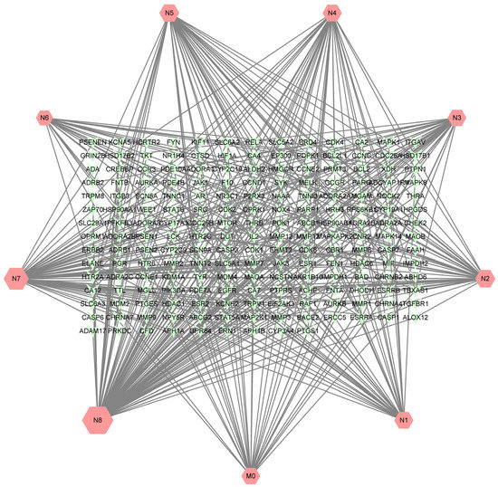 A total of 405 targets were obtained by Swiss Target Prediction, and 191 gene targets remained after removing deduplicates. On the basis of these data, an ingredient-target network was constructed through Cytoscape version 3.8.2. As shown in Figure 7, the network consisted of 200 nodes and 405 edges. There were 33 targets of neobavaisoflavone, while the metabolite (N8) had 99 targets, and the metabolite (N7) had 66 targets. It was indicated that potential pharmacological effect changed, and metabolites of neobavaisoflavone might play a larger role. A Venn diagram was drawn to distinguish neobavaisoflavone from its metabolites, as shown in Figure 8. The targets of neobavaisoflavone were all included in the targets of the metabolites, which further verified that the metabolites had a more potent possibility. It was speculated that N7 and N8 were the main components that exerted pharmacological effects among the above 9 components.