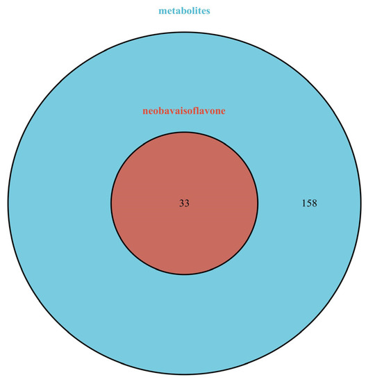 The Venn diagram of targets between neobavaisoflavone and its metabolites. Blue: targets of metabolites; red: targets of neobavaisoflavone.
