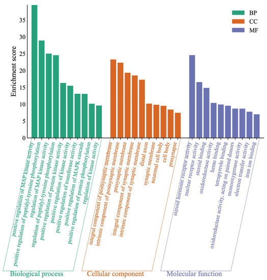 The difference in gene targets might result in pharmacological changes. The enriched terms in BP, MF, and CC categories were selected according to p values less than 0.01. To neobavaisoflavone (Figure 9), the target proteins were mainly involved in the positive regulation of MAP kinase activity, positive regulation of peptidyl-tyrosine phosphorylation, and regulation of MAP kinase activity in the BP category; the target proteins were classified into steroid hormone receptor activity, nuclear receptor activity and steroid binding in the MF category; the target proteins were mainly involved in integral component of postsynaptic membrane, an intrinsic component of the postsynaptic membrane and presynaptic membrane in the CC category.