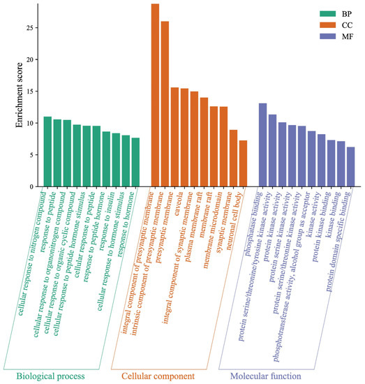 To neobavaisoflavone metabolites (Figure 10), the target proteins were mainly involved in the cellular response to nitrogen compound, response to peptide, and cellular response to organonitrogen compound in the BP category; the target proteins were classified into phosphatase binding, protein serine/threonine/tyrosine kinase activity and protein kinase activity in the MF category; the target proteins were classified into an integral component of the presynaptic membrane, an intrinsic component of the presynaptic membrane and presynaptic membrane in the CC category. The GO enrichment analysis results verified that the metabolites expanded the functional areas and types compared to neobavaisoflavone.