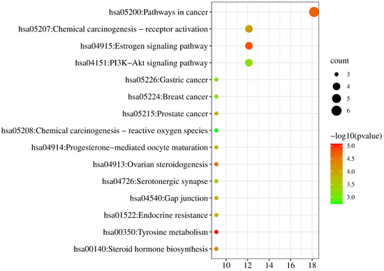 KEGG pathways were enriched from the Metascape database (p < 0.01). Then the relationships between pathways and pharmacological effect mechanism were predicted from the KEGG PATHWAY database (https://www.kegg.jp/kegg/pathway.html, accessed on 28 February 2022). The pathways of neobavaisoflavone were mainly involved in Tyrosine metabolism, Estrogen signaling pathway, Ovarian steroidogenesis, Gap junction, Prostate cancer, Serotonergic synapse, and Chemical carcinogenesis-reactive oxygen species (Figure 11). The descriptions of these pathways from the KEGG PATHWAY database could be corroborated in the literature about neobavaisoflavone. For the neobavaisoflavone metabolites, the number of pathways increased significantly. The pathways mainly involved were Pathways in Cancer, PI3K-Akt signaling pathway, Chemical carcinogenesis-receptor activation, Endocrine resistance, Neuroactive ligand-receptor interaction, Lipid and atherosclerosis, cAMP signaling pathway, Progesterone-mediated oocyte maturation, Serotonergic synapse, Notch signaling pathway, and so on (Figure 12). These confirmed that the neobavaisoflavone had anti-inflammatory and anti-cancer effects. In addition, it could be speculated that neobavaisoflavone had potential antioxidant, whitening, anti-osteoporosis, and estrogen-like effects through querying the KEGG database and the literature [9,10,12]. However, the Steroid hormone biosynthesis pathway is related to lipid metabolism. This finding showed that neobavaisoflavone might interfere with lipid metabolism to produce hepatotoxicity after being absorbed into the blood. Meanwhile, the result was mutually confirmed by the published literature [14]. This discovery will provide a new idea for the study of the toxicity mechanism of neobavaisoflavone. To sum up, the KEGG analysis results further verified that the metabolites research provided a new way to study the pharmacological and toxicological mechanisms of neobavaisoflavone.