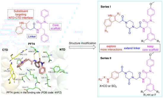 Design principle of piperazinone phenylalanine derivatives with terminal indole or benzene ring as HIV-1 CA modulators. The figure was generated in PyMOL (www.pymol.org, accessed on 20 October 2022).