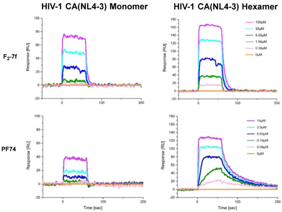 SPR results of F2-7f and PF74 binding to monomeric and hexameric CA constructs.