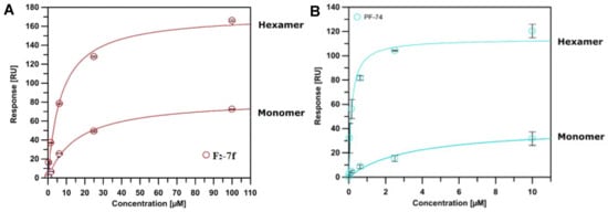 Next, we selected the representative compound F2-7f for direct binding evaluation with monomeric and hexameric HIV-1 CA protein using SPR. We utilized the previously reported SPR method to test the binding affinity and off-rates of F2-7f to CA monomers and CA hexamers, using the lead compound PF74 as an internal control [].