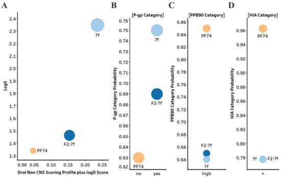(A) Plot showing the StarDrop V7 (Optibrium, Ltd., Cambridge, UK)–derived logS versus a multimetric oral non-CNS profile score. Importance for the score: logS = 0.9, HIA = 0.85, logP = 0.6, logD = 0.6, hERG pIC50 = 0.4, 2D6 affinity category = 0.3, 2C9 pKi = 0.3, P-gp category = 0.3, PPB90 category = 0.2, BBB category = 0.11, BBB log(brain:blood) = 0.11 (B) P-gp category, (C) PPB90 = Plasma protein binding > 90%, (D) HIA = human intestinal absorption category, and probability of prediction of 7f, F2-7f and PF74. The size of the circle correlates with the corresponding score or probability.