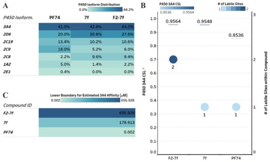 The poor metabolic stability of PF74 limits its use in clinical applications []. For orally administered drugs, the intestinal wall and portal circulation to the liver represents first-pass metabolism and can limit compound concentrations in the bloodstream. Therefore, we next sought to investigate in silico whether or not our compounds had improved predicted metabolic stability over PF74. We employed a computational analysis first demonstrated to be an accurate indicator of metabolic stability by the Cocklin group [,,]. We utilized the P450 module in StarDrop 7 software (Optibrium, Ltd., Cambridge, UK) to predict each compound’s major metabolizing Cytochrome P450 isoforms using the WhichP450™ model. Subsequently, we predicted the affinity to that isoform using the HYDE function in See SAR (BioSolveIT Gmbh, Sankt Augustin, Germany) [,,]. The results of this analysis are shown in Figure 7.