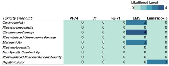 Genotoxicity and hepatotoxicity endpoints for selected compounds. The highlighted table shows the StarDrop V7 (Optibrium, Ltd., Cambridge, UK)–derived toxicity endpoints using the Derek Nexus module with knowledge-based prediction. Structural alerts within the molecule with a level of likelihood for concern are based on precedence from experimental data. Likelihood level 0 = No report; 1 = Inactive; 2 = Equivocal; 3 = Plausible; 4 = Probable. Ethyl methanesulfonate (EMS) was used as a positive control for genotoxicity, and lumiracoxib was a positive control for hepatotoxicity endpoints.