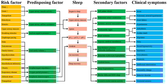 The pathogenesis of OSA can be attributed to anatomical stenosis and pharyngeal dilator dysfunction (Figure 1). Anatomical stenosis includes upper airway anatomical structure stenosis, negative airway pressure and an increase in external tissue in pharyngeal space such as fatty tissue [5,6]. However, the pharyngeal collapse of OSA is partly due to stenosis of the upper airway anatomy [7]. The dysfunction of pharyngeal dilator might also play a key role in the pathophysiology of OSA [8,9]. Obesity can lead to soft tissue enlargement of the upper airway and craniofacial abnormalities, which are also important factors for the anatomical risk of OSA [10].