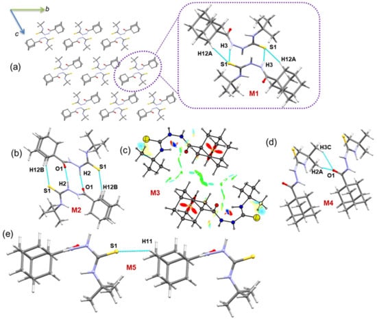 The CLP-PIXEL calculation identifies four energetically significant dimers (M1 to M4) in compound 2. The intermolecular interaction energies for these dimers range from −32.2 to −4.9 kcal mol−1. The complexation energies for the dimers calculated by the PIXEL and DFT methods are comparable. As shown in Figure 4a, the primary motif (M1) is formed by centrosymmetrically related molecules and is stabilized by a pair of N–H···O interactions. This dimer is predominantly electrostatic in nature, with a 74% contribution toward stabilization. The M1 motif has also been observed in closely related structures, namely N-(2-chlorophenyl)-2-(pyridin-2-ylcarbonyl)hydrazinecarbothioamide [56], 2-(2-methoxybenzoyl)-N-phenylhydrazinecarbothioamide, and 2-(2,5-dimethoxybenzoyl)-N-phenylhydrazinecarbothioamide [57], 2-(((3,5-di-t-butyl-4-hydroxybenzyl)sulfanyl)acetyl)-N-(3-fluorophenyl)hydrazinecarbothioamide [58], N-phenyl-2-[tricyclo[8.2.2.24,7]-hexadeca-1(12),4,6,10,13,15-hexaene-5-carbonyl]hydrazine-1-carbothioamide [59], -(4-chlorophenyl)-1-(2-hydroxy-2,2-diphenylacetyl)thiosemicarbazide [60], 2-(4-(5,5-difluoro-1,3,7,9-tetramethyl-5H-6l5,5l5-dipyrrolo[1,2-c:2′,1′-f][1-3]diazaborinin-10-yl)-benzoyl)-N-(4-nitrophenyl)hydrazinecarbothioamide [59]. In addition to N–H···O interactions, green patches (Figure 4a) were located between the cyclohexyl and adamantyl groups due to the short H···H contacts of these groups.