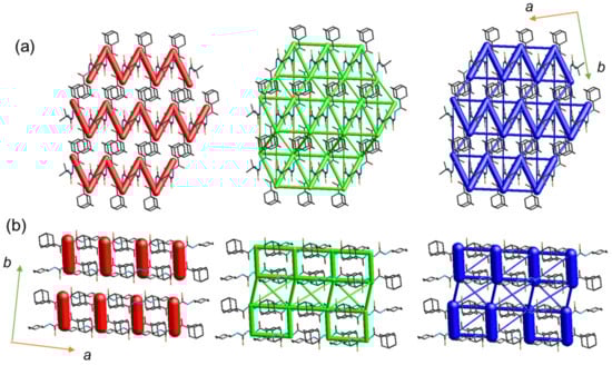 Energy frameworks for the crystal structure of (a) 1 and (b) 2. The electrostatic (red), dispersion (green) and total interaction (blue) energies are represented as cylindrical tubes with size 80. The interaction energies with magnitudes smaller than −15 kJ mol−1 have been omitted for clarity.