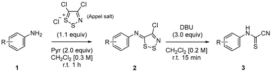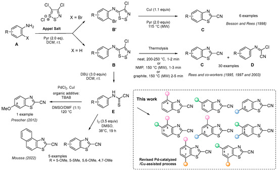 One of the most popular methods described in the last 10 years for the synthesis of 2-cyanobenzothiazoles was inspired by the work of Rees and colleagues [46,47,48]. In the early 1990s, they studied the chemistry of 4,5-dichloro-1,2,3-dithiazolium chloride (Appel salt) [49] and described the synthesis of 2-cyanated benzothiazoles (C) by thermolysis of 5-N-arylimino-4-chloro-1,2,3-dithiazoles (B) [50,51], obtained by the reaction of aromatic amines (A) with Appel salt (Figure 1).