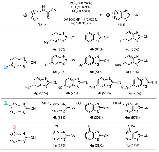Firstly, 2-, 3- or 4-mono-substituted cyanothioformamides 3a-p were transformed into the corresponding 4-, 5- and 6-mono-substituted 2-cyanobenzothiazoles 4a-p according to the already optimized C-H functionalization/intramolecular C-S bond formation reaction (Scheme 2).
