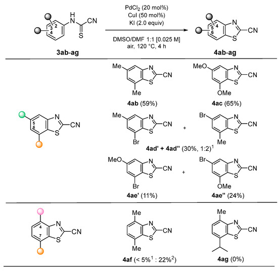 Synthesis of 5,7- and 4,7-di-substituted 2-cyanobenzothiazoles (4q-4aa) from corresponding 3,5-, and 2,5-di-substituted cyanothioformamides (3ab-3ag) (isolated yields). 1 Yields calculated from 1H-NMR. 2 KI was replaced by LiBr.