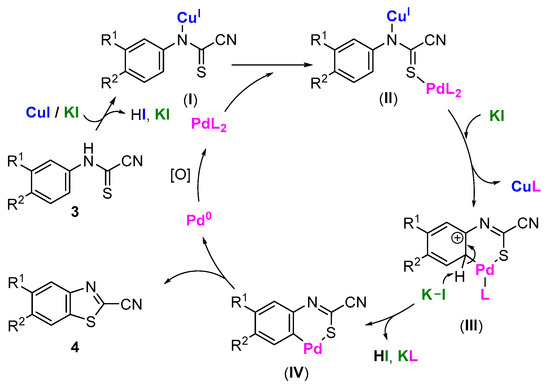 For the last 10 years, our group investigated the chemical application of Appel Salt and its 5-N-arylimino-4-chloro-1,2,3-dithiazole derivatives for fusing the 2-cyanobenzothiazole motif on pyrimidine or pyrimidinone systems, and synthesizing bioactive thiazoloquinazolines and quinazolinones, which are able to affect the activity of kinases involved in neurodegenerative diseases (Alzheimer’s disease, Down’s syndrome) and cancers [58,59,60,61]. Recently a new strategy in our molecular and biological targets incited us to develop more practical and efficient general synthetic protocols. It appeared relevant and useful to allow easy access to diversely substituted and functionalized 2-cyanobenzothiazole derivatives. The present study thoroughly investigates a convenient palladium-catalyzed and copper-assisted method for the synthesis of a large array of these compounds and improves upon the existing literature. It also aims at exploring the regioselectivity of the thiazole ring closure under the steric or electronic influence of substituents present on the starting anilines. For the first time, a reaction mechanism is suggested in adequation with the data obtained (Figure 1).