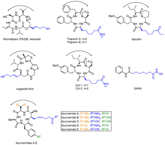 Examples of naturally occurring cyclic peptides characterized as HDAC inhibitors. Direction of N- to C-termini is indicated by arrow. The zinc-binding group is indicated by blue color.