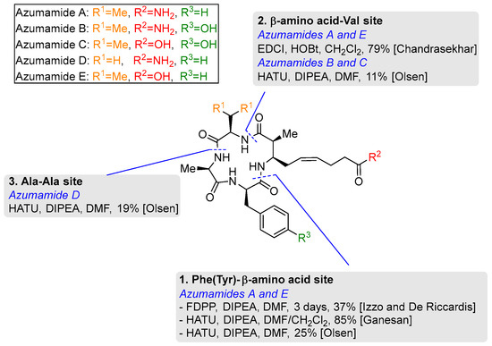 As aforementioned, Chandrasekhar et al. applied an Amnda analog containing a PMB-protected terminal alcohol to synthesize a cyclic intermediate, which was obtained by macrocyclization of a linear tetrapeptide at the Amnda-Val site using EDCI and HOBt as coupling reagents at 79% yield [22]. Olsen et al. also used this site to synthesize azumamide C obtained at 11% yield by treatment of HATU and DIPEA in DMF [21]. Subsequently, azumamide B was synthesized by transforming the terminal ethyl ester to a carboxamide via hydrolysis of ethyl ester and coupling with ammonia under DIC conditions [21].