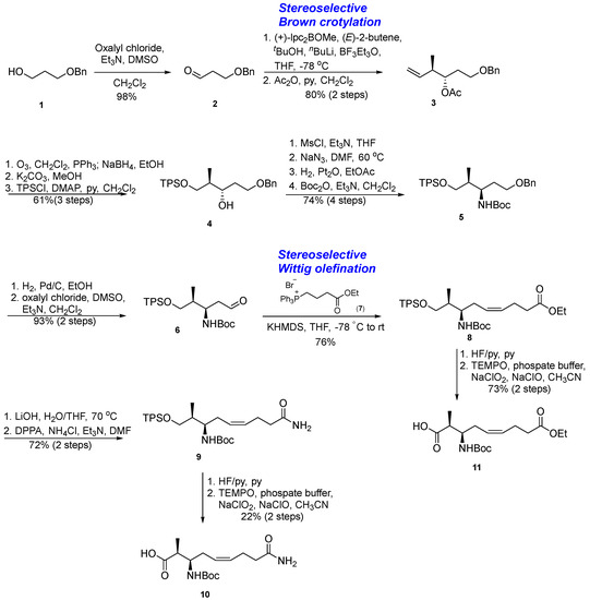 3.1.1. Synthesis of β-Amino Acid via a Stereoselective Brown’s Crotylboration and Wittig Olefination