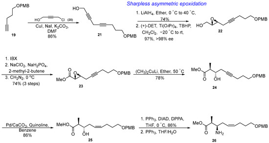 An asymmetric epoxidation, diastereo- and regioselective epoxide opening, and a partial reduction of the triple bond were applied to synthesize the Amnaa (Scheme 3) [22]. The synthesis commenced with the PMB protection of propargylic alcohol, followed by coupling with 20 in the presence of CuI, NaI, and K2CO3. The propargylic alcohol 21 was selectively reduced by LiAlH4 to obtain (E)-allyl alcohol, which was exposed in the Sharpless asymmetric epoxidation resulting in the formation of 22 at 97% yield and >98% ee. After obtaining the epoxy ester 23 via the oxidation of the primary alcohol in two steps and esterification with diazomethane, a regio- and stereoselective epoxide opening was performed with the methyl cuprate generated following the literature procedure [25]. As a result, two chiral centers were successfully generated with excellent stereoselectivity. Then, the partial hydrogenation of 24 using Lindlar’s catalyst established the key functional group (Z)-olefin. Mitsunobu reaction with DPPA, followed by the reduction of the azide group, generated β-amino acid 26 with inversion of the configuration. The PMB-protected terminal alcohol was converted to a carboxylic acid at the late stage after the construction of the cyclic tetrapeptide via PMB deprotection and oxidation in the presence of BAIB and TEMPO.