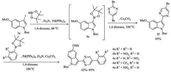 Et3N (4 mL, 80 mmol) and pinacolborane (1.8 mL, 12 mmol) was added to a solution of 3a–3d (8 mmol) and Pd(PPh3)4 (0.28 g, 0.24 mmol) in 1,4-dioxane (50 mL), under argon, and the reaction mixture was stirred at 80 °C for 3 h. After the completion of the reaction, it was cooled to room temperature. Then, 2-iodo-5-bromopyrimidine (1.1 g, 4 mmol), Cs2CO3 (6.5 g, 20 mmol), and CH3OH (40 mL) were added under argon and the reaction mixture was stirred at 100 °C overnight. After the completion of the reaction, the solvents were removed under reduced pressure. The residue was purified by column chromatography on silica gel with CH2Cl2/CH3OH to yield compounds 5a–5d.
