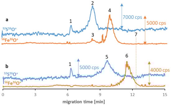 CE-ICP-MS/MS electropherograms’ MS/MS signals 32S16O+ and 56Fe16O+ of a mixture of Fe3O4@Citr (10–20 μg Fe/mL) and transferrin (a) and albumin (b), 1 mg/mL each, diluted in 10 mM phosphate buffer, pH 7.4, and 100 mM NaCl, and incubated at 37 °C for 6 h. Signal assignment: blank sulfur signal (1), transferrin (2), Fe from the transferrin (3), Fe3O4@Citr (4 and 6), albumin (5), Fe3O4@Citr analyzed individually (7); separation under optimized conditions (see Table 1 and Table 2).