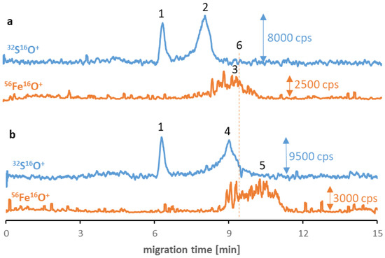 CE-ICP-MS/MS electropherograms’ MS/MS signals 32S16O+ and 56Fe16O+ of a mixture of Fe3O4@PEG (10–20 μg Fe/mL) and transferrin (a) and albumin (b), 1 mg/mL each, diluted in 10 mM phosphate buffer, pH 7.4, and 100 mM NaCl, and incubated at 37 °C for 6 h. Signal assignment: blank sulfur signal (1), transferrin (2), Fe3O4@PEG (3 and 5), albumin (4), Fe3O4@PEG analyzed individually (6); separation under optimized conditions (see Table 1 and Table 2).