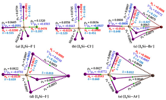 (a–e) [ωB97X-D/def2-QZVPPD] level QTIM-based molecular graphs of [I4Si···X−] (X = F, Cl, Br, I, At), showing the bond paths (solid and dotted lines in atom color) and bond critical points (tiny spheres in green) between bonded atomic basins. Large spheres represent the atomic basins, with atoms labeled. The dotted black line in (d,e) is artificially drawn to represent the presence of tetrel bond between Si and X (X = I, At). The charge density (ρb), the Laplacian of the charge density (∇2ρb), the total energy density (Hb), and the delocalization index (δ) values are shown in black, blue, red, and faint-blue fonts (in a.u.), respectively.
