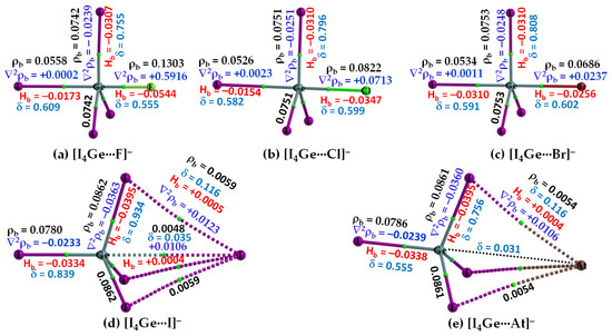 The bond path and bond critical point features of QTAIM appear between the C and F atomic basins indicate the presence of a C···F tetrel bond in [I4C···F−], Figure 4a. The appearance of such bond path topologies between F and I atomic basins also indicates the presence of three equivalent I···F close contacts in [I4C···F−]. The latter ones mimic the I···X (X = Cl, Br, I, At) links in the other four members of the same family (Figure 4b–e). However, QTAIM did not reveal the presence of any Tt···X tetrel bonded contacts in [I4C···X−] when X = Cl, Br, I, and At. Although this kind of σ-hole interaction is expected based on inferences from the results of the MESP model (Figure 2, Bottom), their absence in the QTAIM molecular graph may be due to the stringent nature of boundaries between bonded atom basins as determined by the arbitrary nature of the space partitioning approach. Similar observations have been reported in several previous instances that do [88] or do not [89,90,91] involve tetrel bonding.