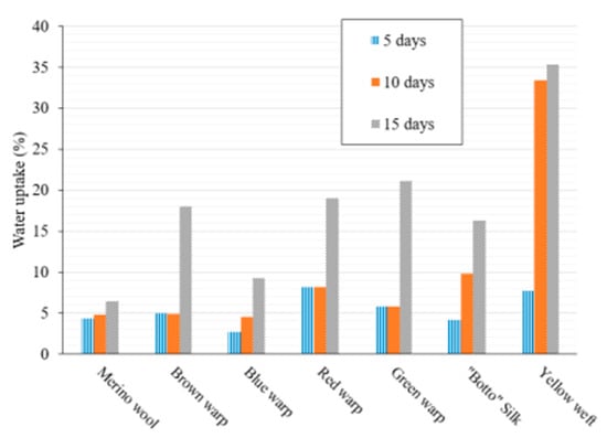 The commercial merino wool and the “Botto” silk samples were subjected to water uptake investigations to assess their tendency to absorb water vapor and, consequently, their hygroscopicity. The measurements were conducted by exposing the samples to a controlled atmosphere (temperature of 25 °C and relative humidity of 75%). The exposure time in the controlled atmosphere was systematically varied with the aim of obtaining kinetic information on the water absorption process. Figure 1 shows the water uptake values at different time (5, 10 and 15 days) for each sample. It should be noted that results after 30 days did not show any relevant difference compared to the water uptake after 15 days (See Supplementary Materials). This result agrees with the literature findings providing ca. 15 days of equilibration time for similar yarn samples [17].