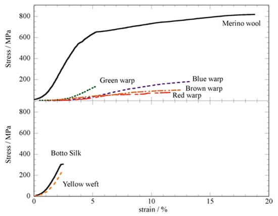 Stress vs. strain of commercial Merino wool, “Botto” silk and the Sixteenth Century yarns.