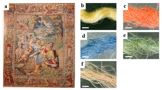 Optical photo of the Flemish Tapestries (348.5 cm × 250 cm) of the Sixteenth Century (a) and optical micrographs of yarns: yellow weft (b), red warp (c), blue warp (d), green warp (e) and brown warp (f). Scale bars are 1 mm.