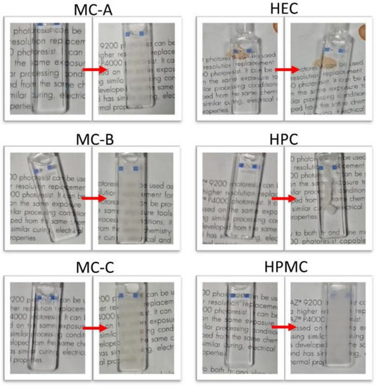 The visual comparison between the different cellulose derivatives before and after reaching the LCST revealed some differences. The scattering phase of methyl-celluloses sill maintained a minimum of transparency which allowed to glimpse the text underneath. HEC did not show any evident scattering phase upon heating; therefore, it was not considered anymore in this study. HPC produced a narrow scattering solid immersed in the transparent matrix. HPMC scattering phase was highly opaque and perfectly hid the text behind (Figure 2). In general, the opacity occurs instantaneously as the transition temperature is reached and, as soon as it is cooled, the solution becomes transparent again.