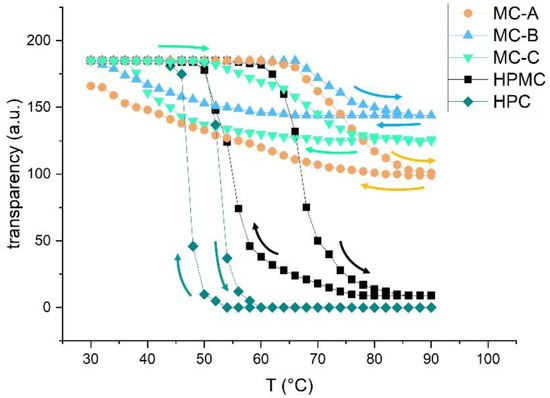 As reported by the plot in Figure 3, all the tested solutions reached the LCST between 50 and 70 °C upon heating. As already noticed by eye observation, the hot-stage measurements confirmed that the transparency loss of the scattering state is different for the materials; the methyl-celluloses preserve a certain amount of transparency, while for HPC and HPMC, the transparency loss is more pronounced. This indicates that the chemical functionalization is a critical value affecting the scattering state of cellulose ethers. Specifically, the introduction of aliphatic chains with hydroxy functionalities produces a more efficient scattering phase with respect to substitution with methyl groups only. On the other hand, the scattering state of HPC resembles more a solid polymer than a hydrogel (see the corresponding photograph in Figure 2), indicating that hydroxypropyl functionalization leads to a highly compact globule phase. It must be considered here that the degree of substitution (the average number of substituent groups attached to the ring hydroxyls), which for commercial cellulose ethers is generally kept in the range 1.5–1.9 to assure the maximum water solubility, can also play a role in the scattering capacity. Upon cooling, the reverse process is more gradual for all the materials with respect to the heating one, resulting in slightly lower transition temperatures from scattering to transparent with respect to the forward LCST.