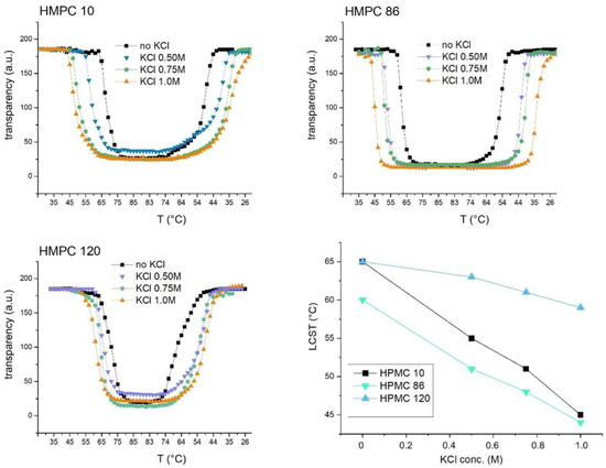 All the three HPMC batches showed similar temperature-dependent transparency variations, as evidenced by the shape of the plots in Figure 5. The similar values recorded in the flat bottom part of the curves indicate that the transparency loss after gelification was only slightly affected by viscosity. As expected, by increasing the salt concentration, the “salting-out” effected is augmented for all the polymer solutions, causing the lowering of the respective LCST. This concentration-dependency effect is more pronounced for HPMC10 and HPMC86, for which we observed a variation of 20 and 15 °C, respectively, between the solution with no salt and the one spiked with KCl 1.0 M. For HPMC120, the observed LCST variation is in the range of 5 °C, which suggests that the high molecular weight polymer is only partially affected by the presence of co-dissolved salts.