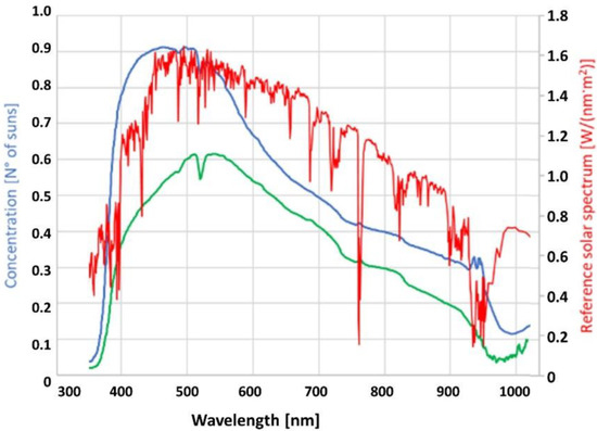 where Irc is the concentrated irradiance, is the concentration factor and is the reference solar spectrum AM 1.5 D [36,37]. The ratio between Irc and the reference solar irradiance Ir1s (1 sun), provided the CS values reported in the plot of Figure 6:
