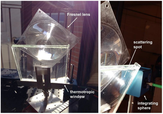 The solar concentration experiments were performed by focalizing the solar radiation on a glass cell of 160 × 160 × 4 mm filled with the thermotropic fluid, by using a PMMA Fresnel lens. The temperature of glass surface in correspondence of the concentrated light spot during a sunny day reached 50–55 °C. Data were acquired by positioning an integration sphere on the edge of the window and on the window’s face, towards the sun (Figure 7).