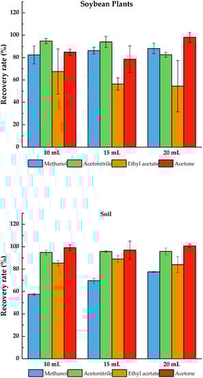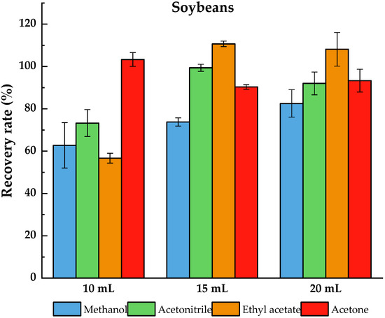 Anastassiades et al. [21] showed that when performing pesticide residue extraction, the salinization effect of MgSO4 and NaCl with a mass ratio of 4:1 as a salinizing agent is the best; therefore, 4 g MgSO4 and 1 g NaCl were selected as the salinizing agents. In this experiment, we compared the effects of aqueous solution of four organic solvents on the extraction efficiency of pydiflumetofen from soybean in three different extraction volumes. The tests results are shown in Figure 1, and the recovery rates were evaluated by the following equation: