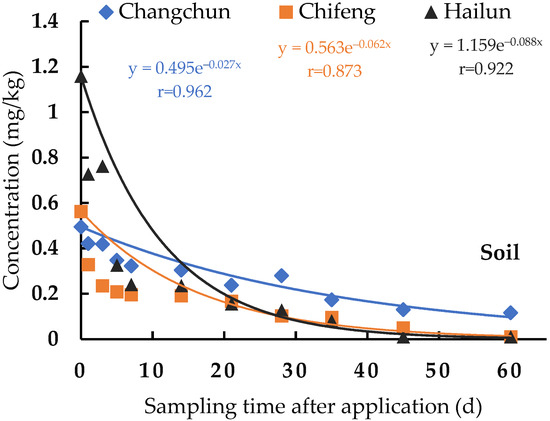 The degradation dynamics of pydiflumetofen were analyzed for 2 h–60 d after application, and the results are shown in Table 2. The initial deposits of pydiflumetofen in the plant and soil were 21.50–45.22 mg/kg and 0.49–1.16 mg/kg, respectively. The initial residues in the plant were higher than those in the soil samples, mainly because the soil samples were collected at a depth of 0–10 cm, and pydiflumetofen was presented on the surface of the soil, while the soil below acts to dilute the pydiflumetofen. The difference in the degradation rate of pydiflumetofen in the plant was low between the different test sites; however, the difference was high in the soil samples, presented as Hailun > Chifeng > Changchun. We speculated that the degradation rate of pydiflumetofen in the soil may be related to the environmental conditions at the experimental sites. As shown in Table S2, the soil organic matter of Hailun’s was 4.6%, Chifeng was 1.7%, and Changchun was 2.6%. The organic matter content in the Hailun soil was significantly higher than that in the soils of the other two locations, which could be the main reason why the digestion rate of pydiflumetofen in the Hailun soil was faster than the soil of the other two locations. The soil organic matter content in Changchun was slightly higher than that in Chifeng; however, the degradation rate was lower than that in Chifeng, which may be affected by factors such as the type of microorganisms in the soil, temperature, humidity of the environment, and the sunshine duration.