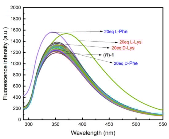 Fluorescence spectra of (R)-1 (2.0 × 10−5 M) with 20 eq amino acids (0.1 M, D/L-Phe, D/L-Ala, D/L-Met, D/L-Pro, D/L-Glu, D/L-Gln, D/L-Arg, D/L-Lys, D/L-Leu, D/L-Ser, D/L-Thr, D/L-Asn, D/L-Asp, D/L-Val, D/L-His) in an aqueous solution. (λexc = 280 nm, slits: 5.0/2.5 nm.)